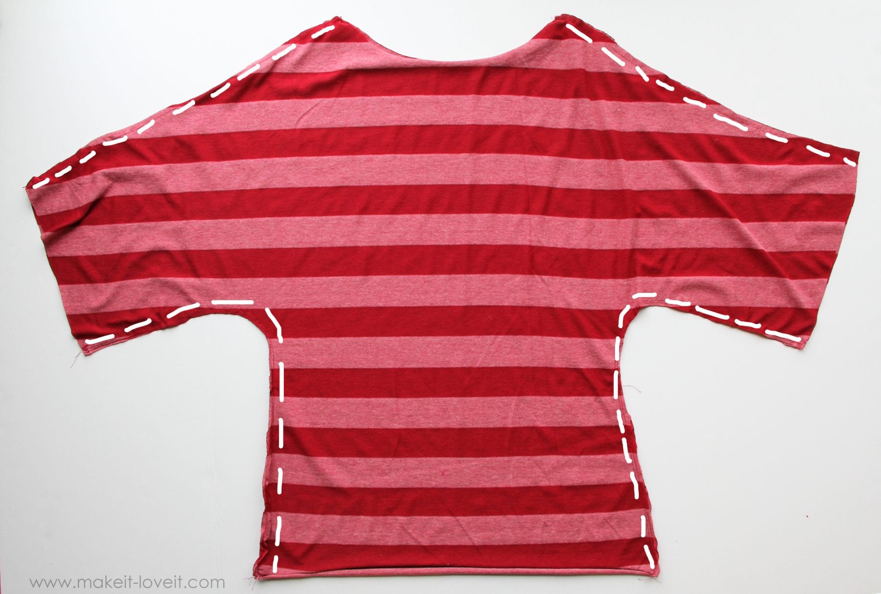Like mentioned above, I cut my front and back pieces exactly the same. But if you want your front neck line to swoop downward a bit more, cut accordingly. Then I sewed the front and back pieces together, with right sides together, right along the top of each sleeve and then along each side of the shirt.