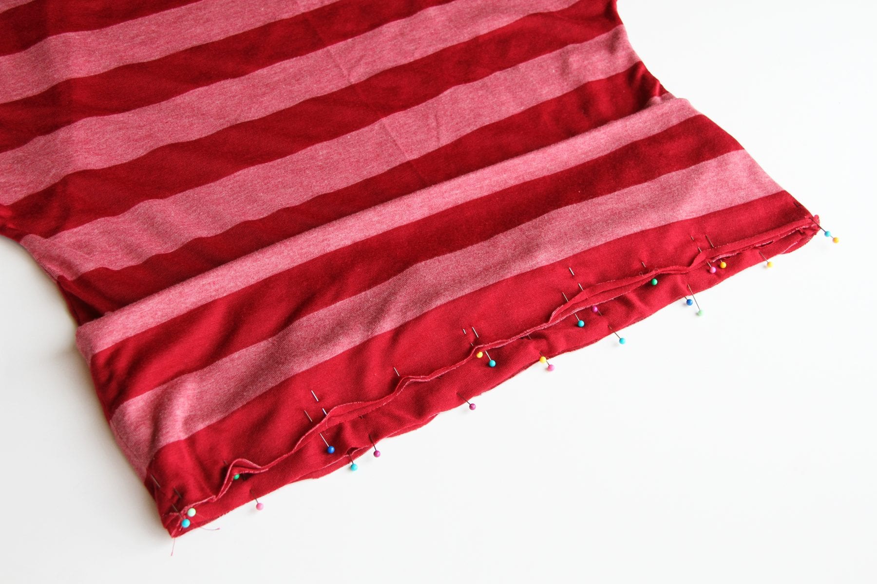 Then, I cut a little bit off the width of the strip of fabric so that the band would end up slightly smaller than the bottom of the shirt. Because you want it to slightly pull the bottom of the shirt in. Not tons, just a bit. And how much you cut off really depends on how stretchy your knit is so you may have to try on the shirt and then wrap the band section around you to see how much smaller to make it, to have a snugg-ish fit around your hips.