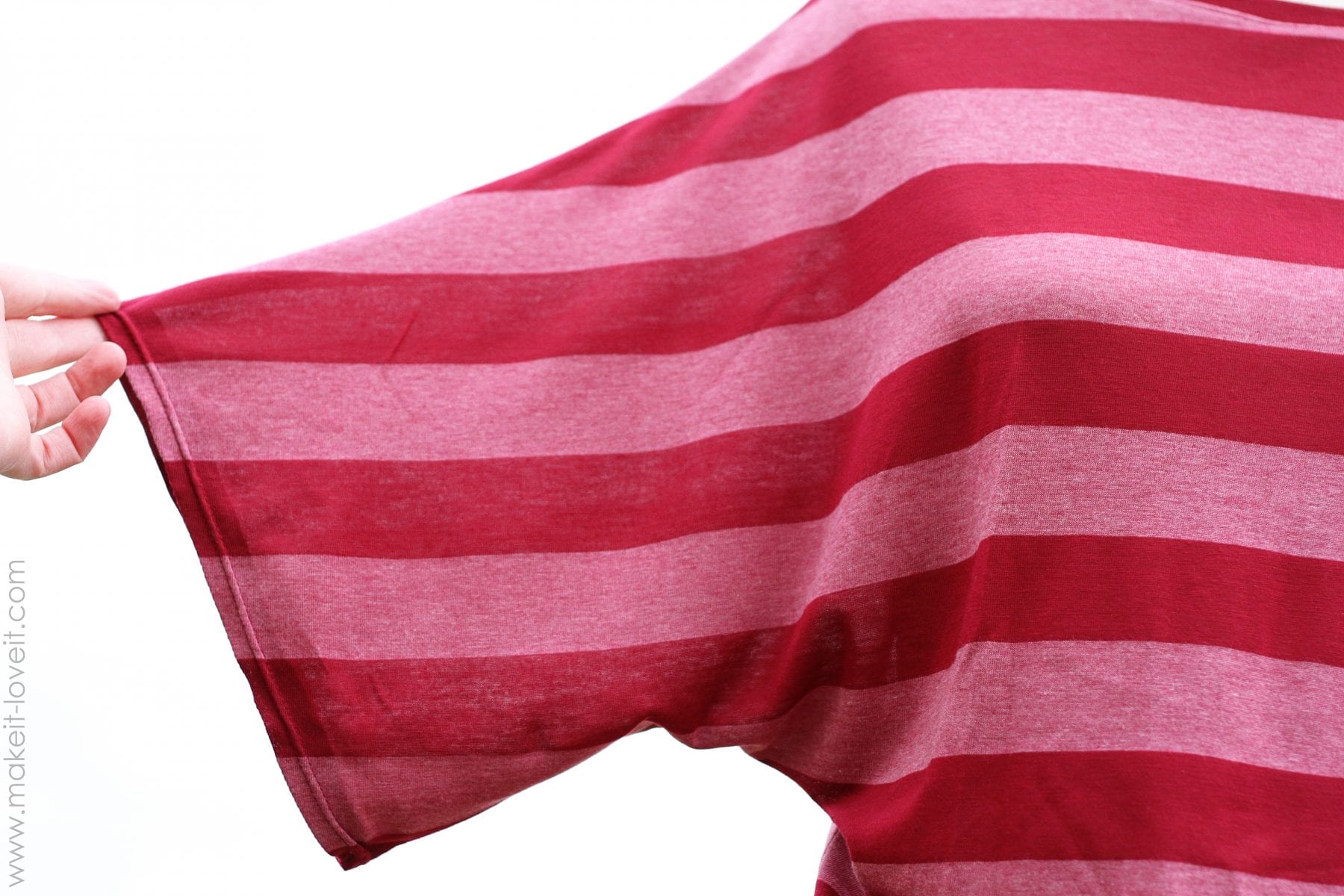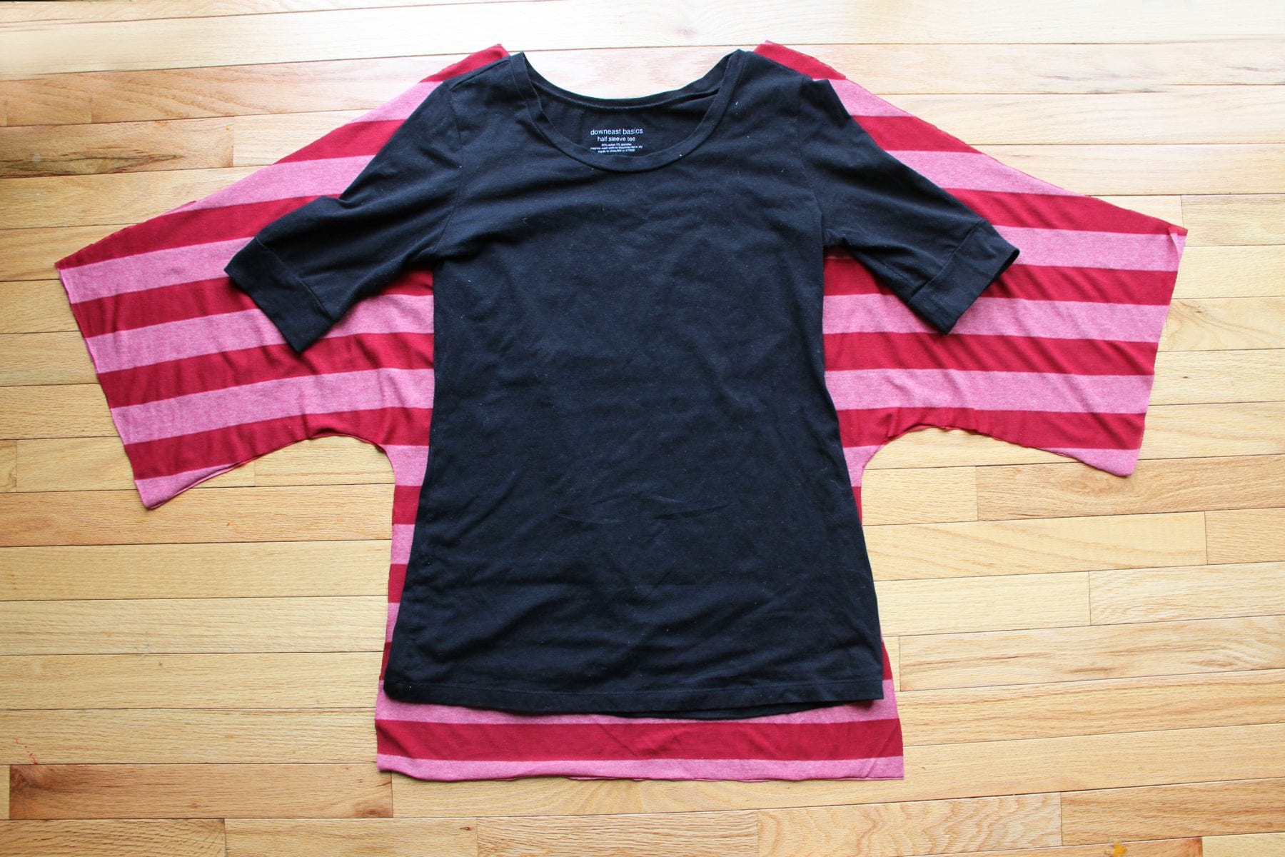 Okay, grab some jersey knit. Nothing too stiff. I was originally going to use an oversized knit maxi skirt that I bought a year or so ago (to use for the fabric)…..but then I remembered about this striped fabric that I had stashed away. Just keep in mind that if you can’t find any knit at the fabric store/online, check out the clearance racks. You may find some great large pieces of knit just hanging there, waiting to be re-purposed.