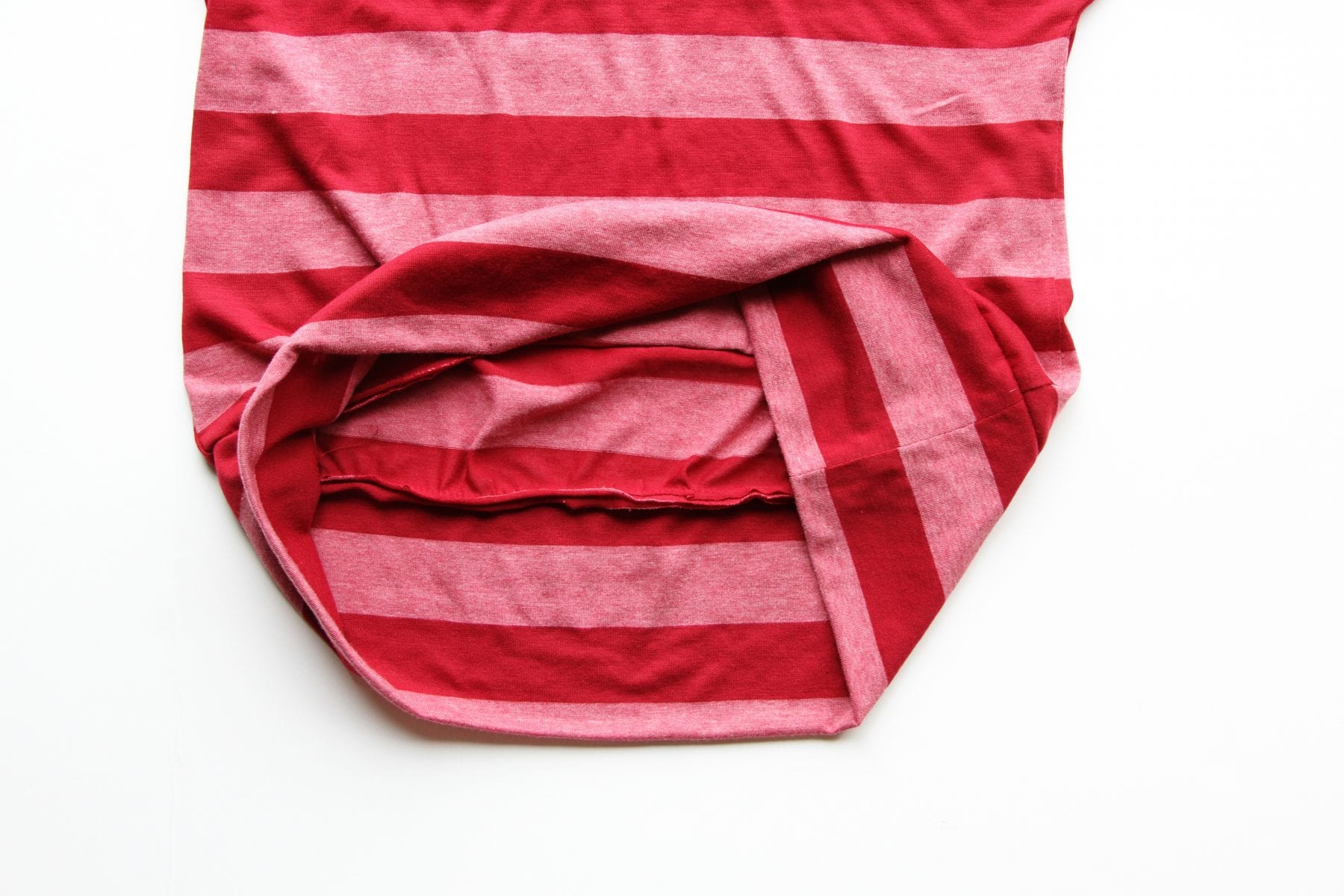 Now sew these 3 layers (1 layer of shirt and 2 layers of tube) together, sewing all the way around the bottom of the shirt. Use a very narrow zig-zag stitch (or something similar) to allow the fabric to stretch even after it’s sewn. Because you want it to stretch around your hips.